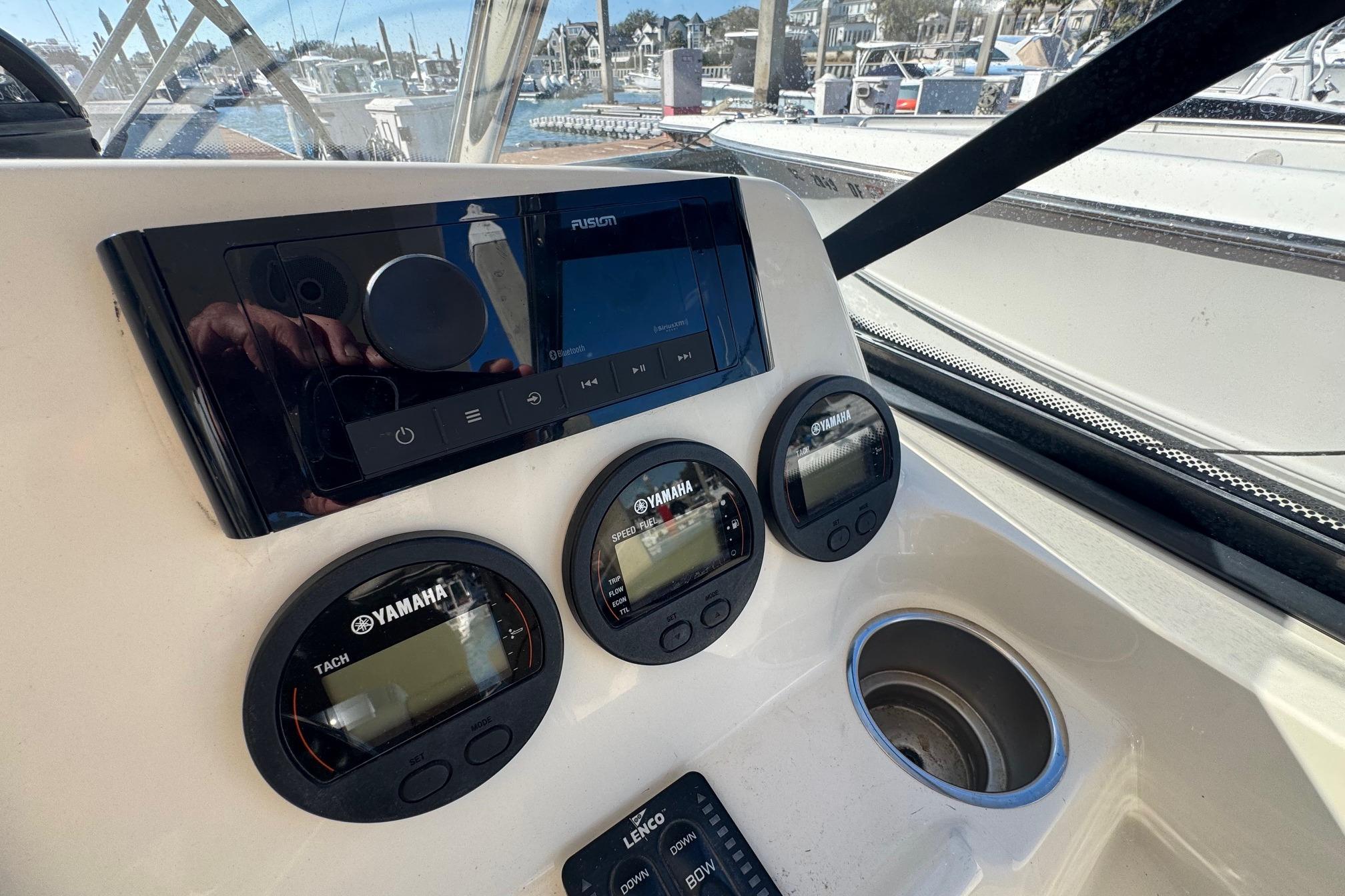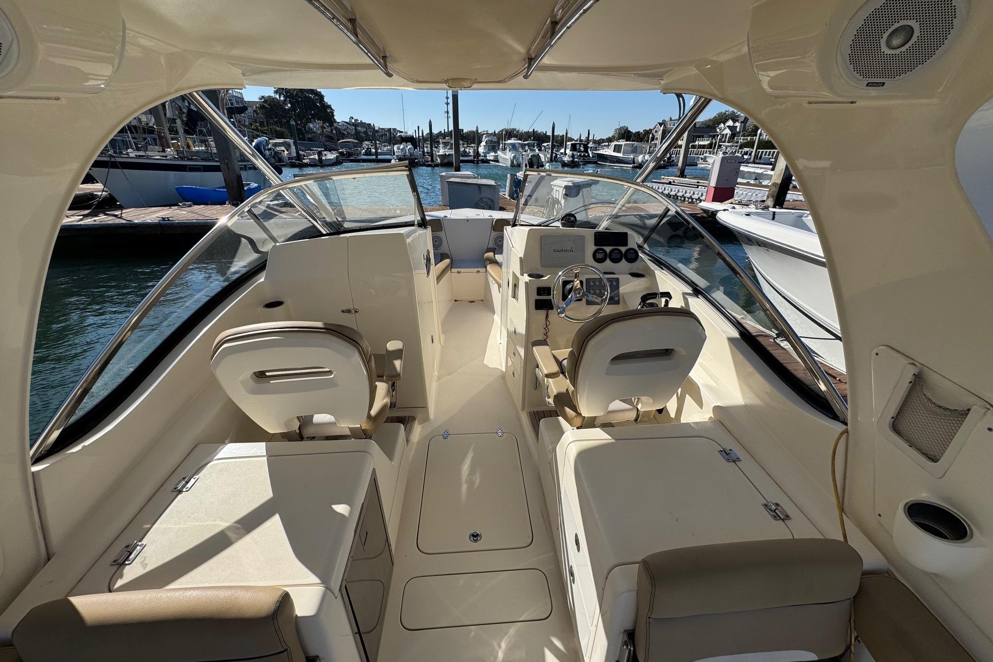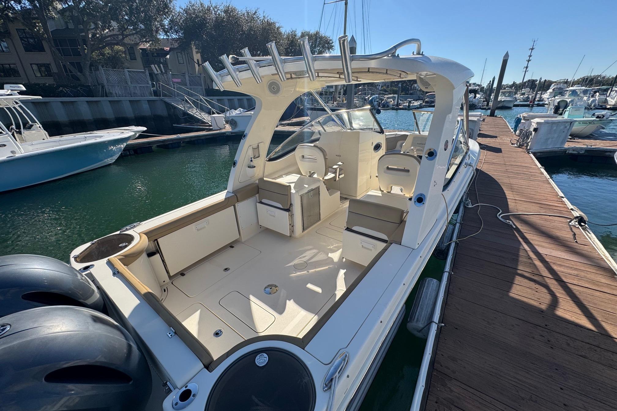 Her roomy cockpit with double helm seating, aft-facing lounge, and convertible transom seating makes her ideal for entertaining guests dockside or while underway. Below, the inviting cabin layout features a fully equipped galley, a private forward stateroom, convertible dinette, and a mid-cabin lounge that converts to an additional berth - allowing comfortable overnight accommodations for up to six.