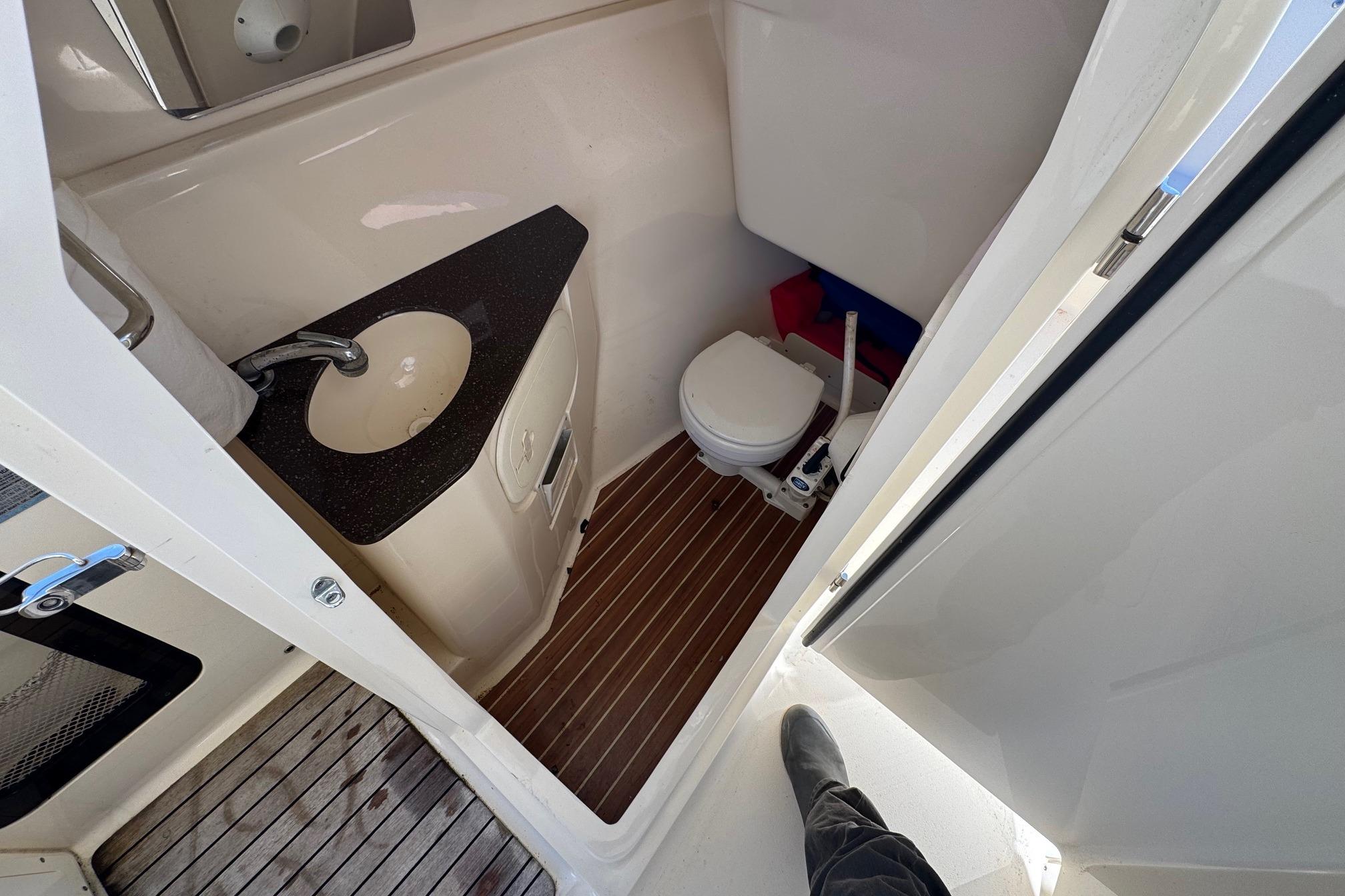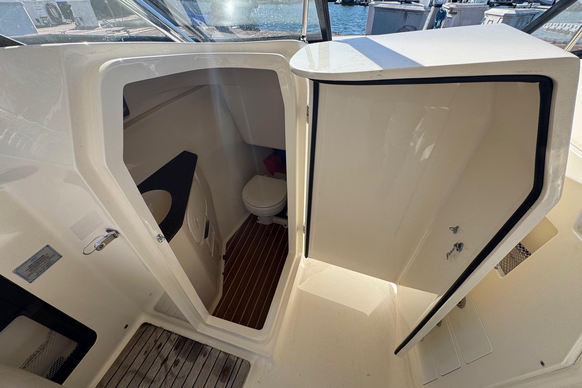 The 34 Sport Sedan offers comfortable accomodations with a surprising amount of room for a vessel of this size. Entering the salon you will find the galley direcly to port with full-size fridge, stainless steel double sink, three (3) burner electric stove/oven, generous counter space and ample storage. Directly across there is an L-shaped seating area. There is a lower helm just forward of the seating area.