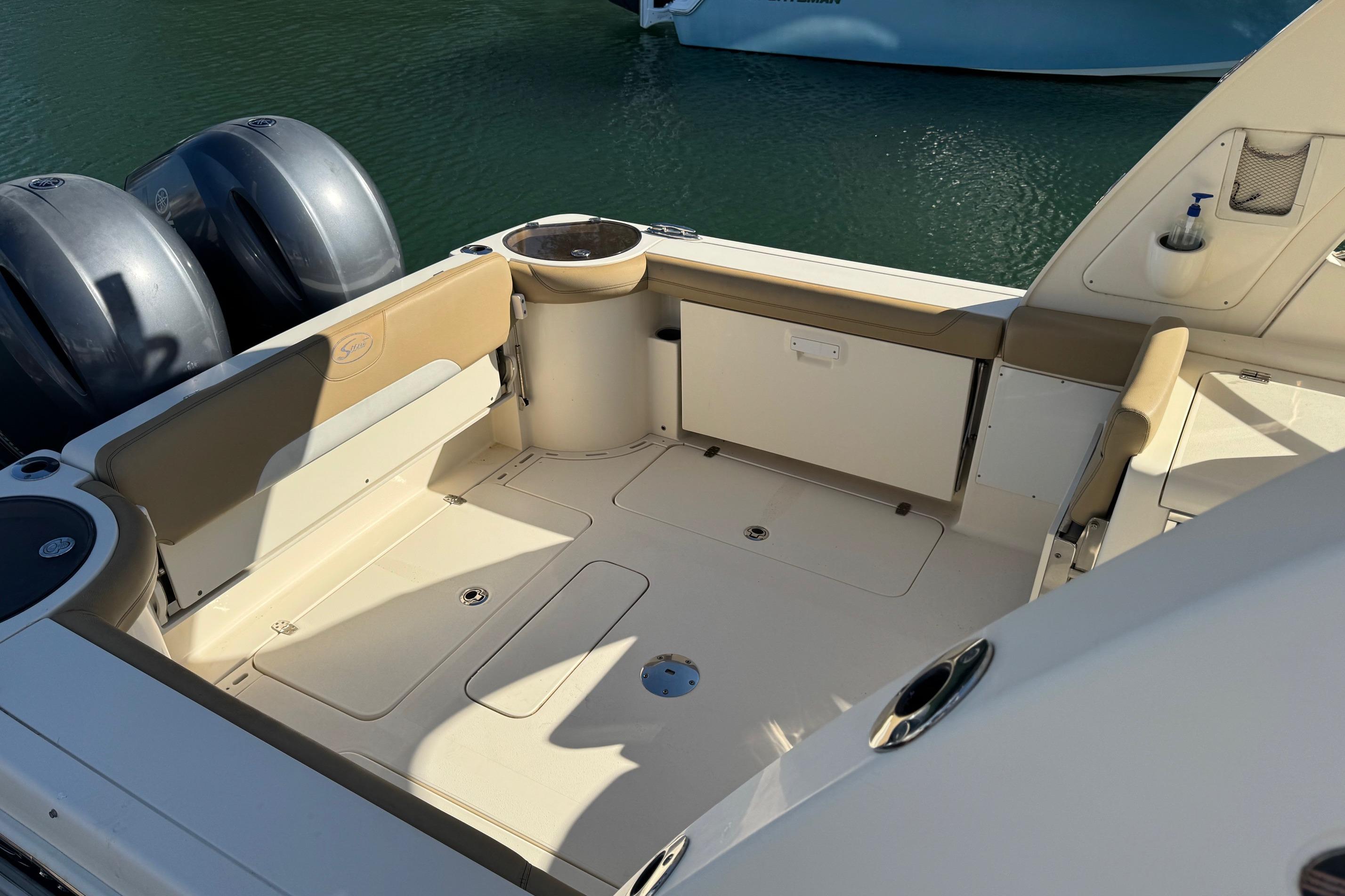 Single-level design with double helm/companion seats, aft-facing lounge, removable cockpit table (converts to sunpad), transom bench, wet bar, cooler, and engine access hatches.