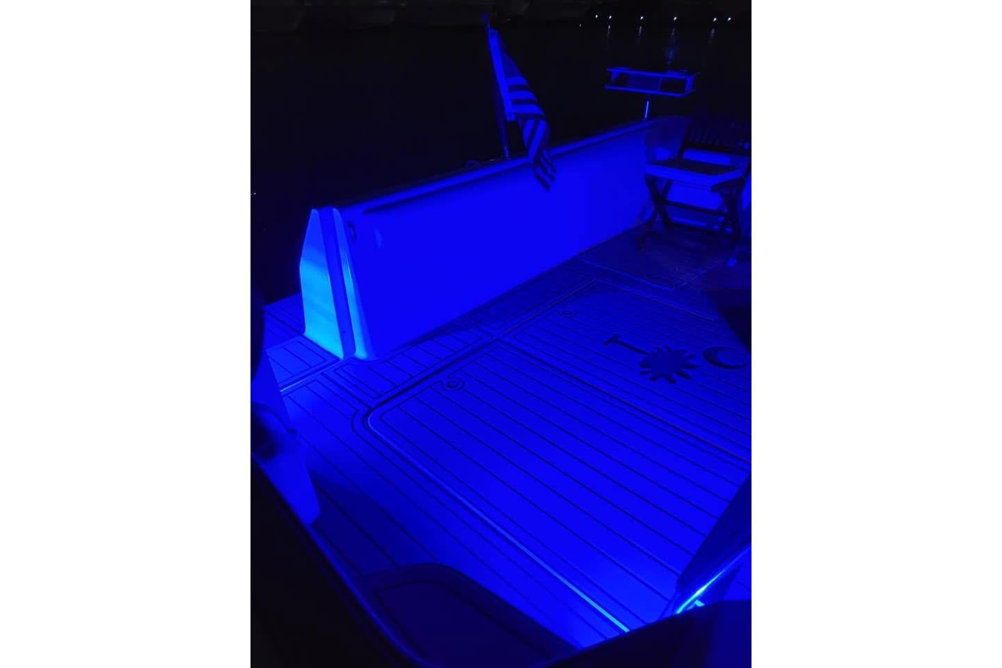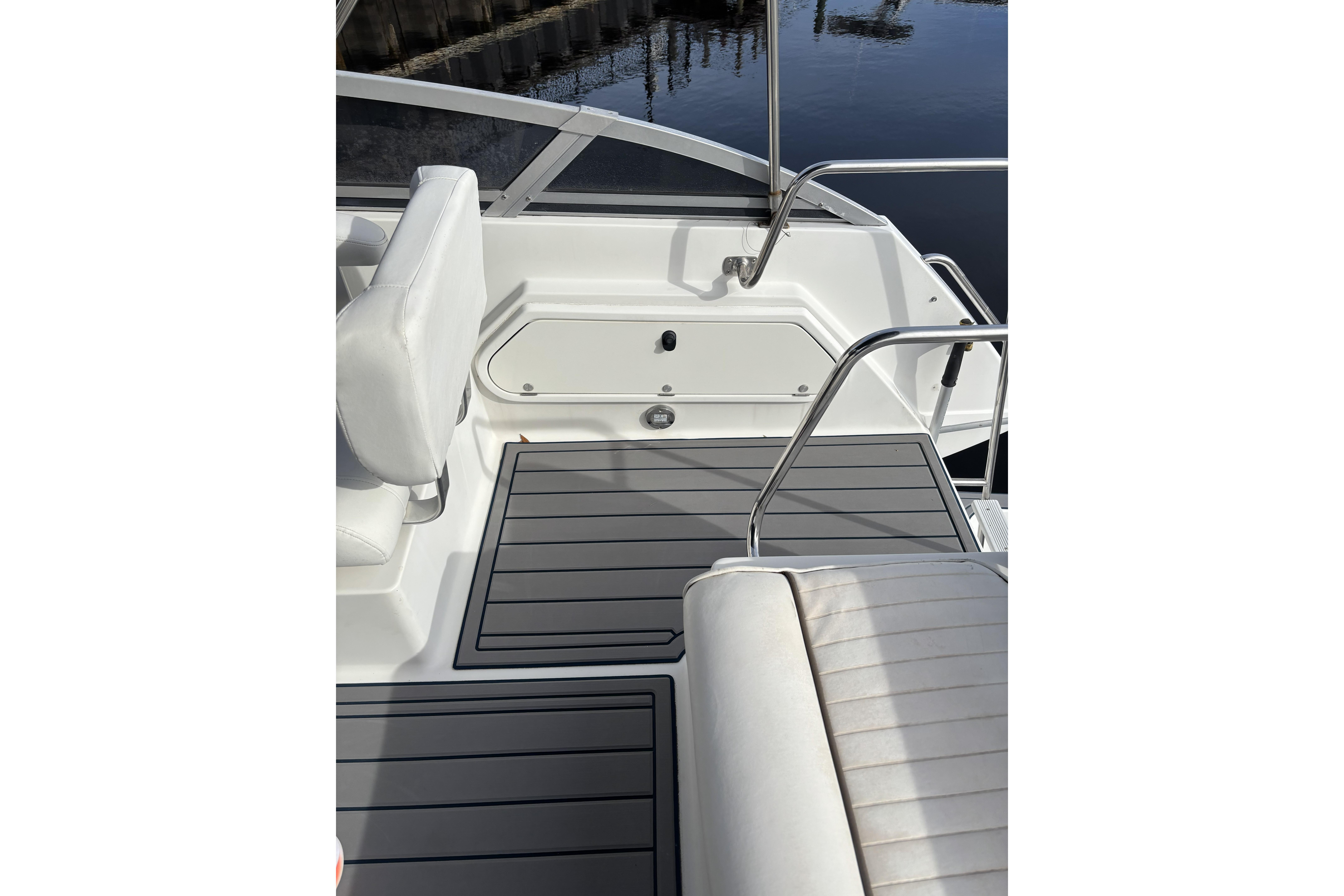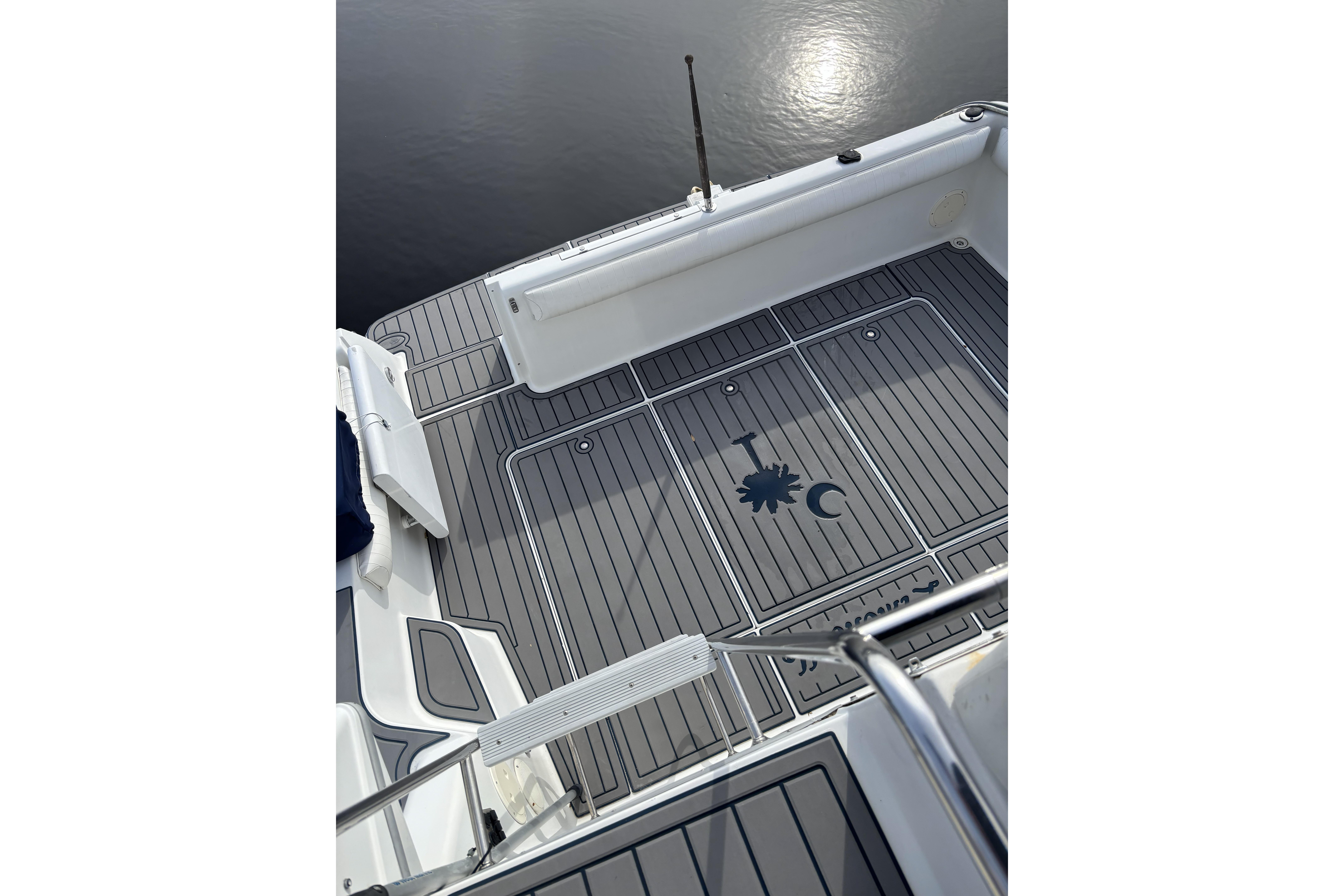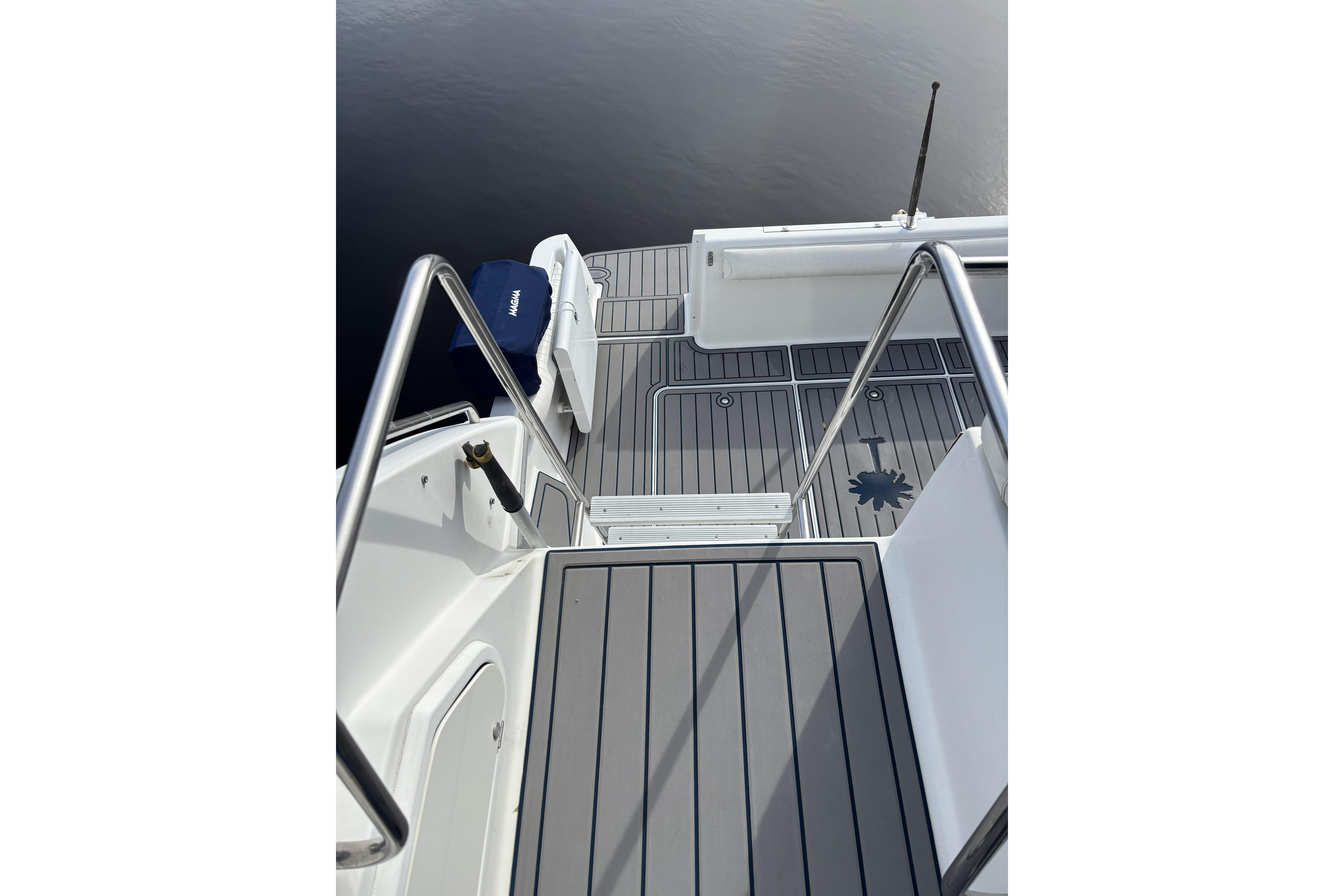 The vessel features a large flybridge with dual helm seats and guest seating, and a spacious cockpit with easy access to an integral swim platform. The interior offers a wide-open layout to maximize living space, including a full galley, convertible dinette, private forward stateroom, and enclosed head.