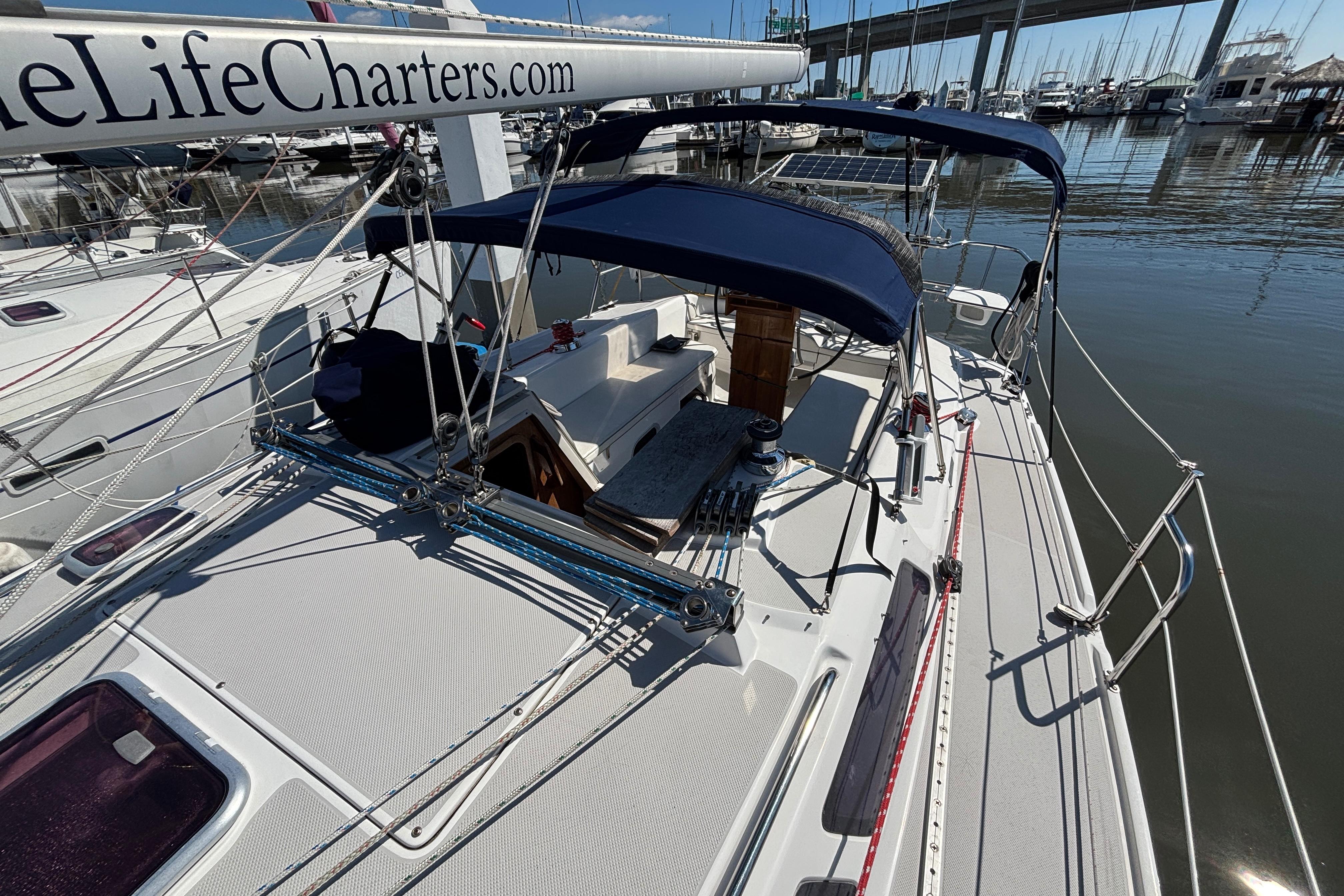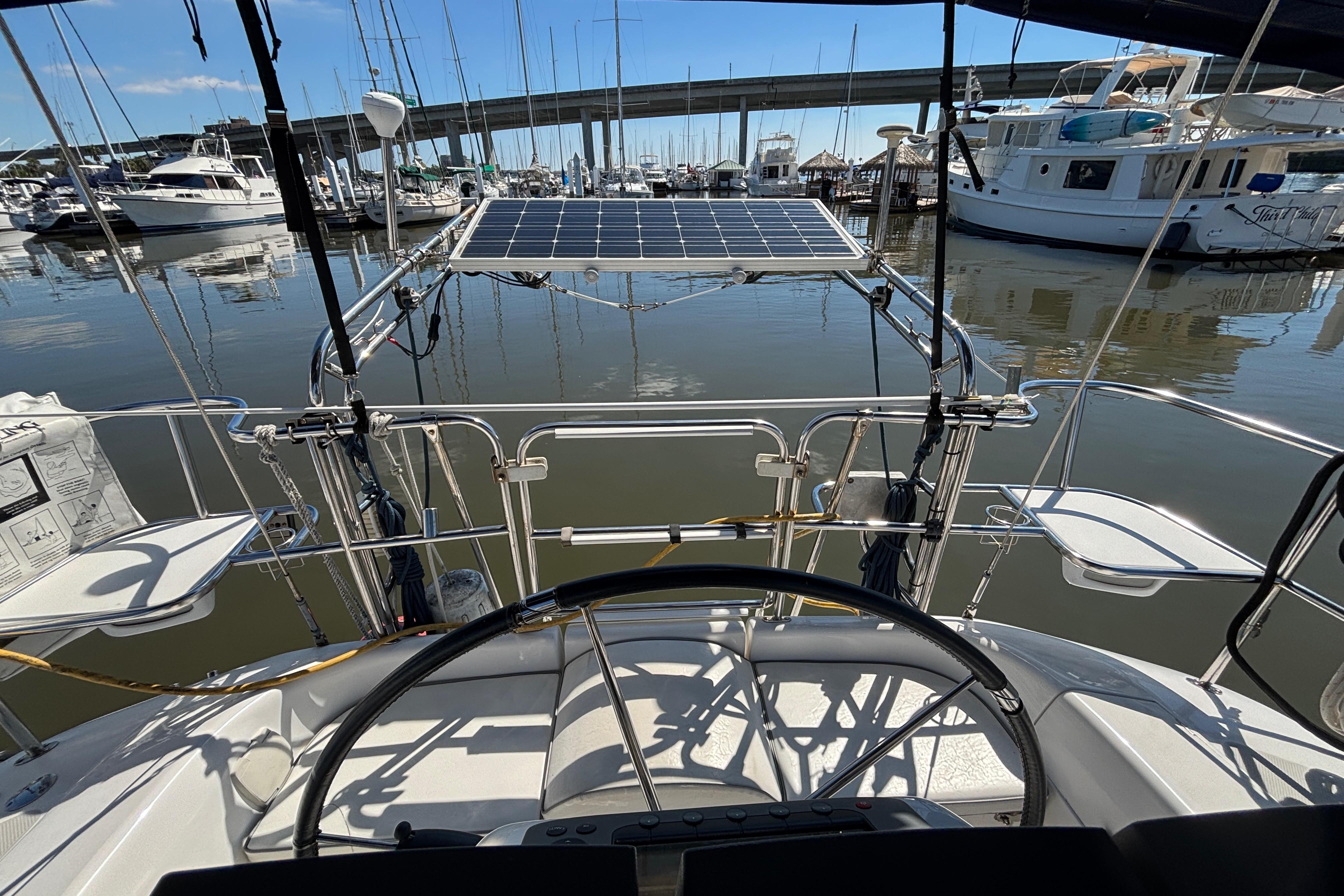 Wire standing rigging is attached to deck plates that connect stainless tie rods located in the main salon to an L-shaped aluminum bar laminated into the hull that acts as a chainplate.